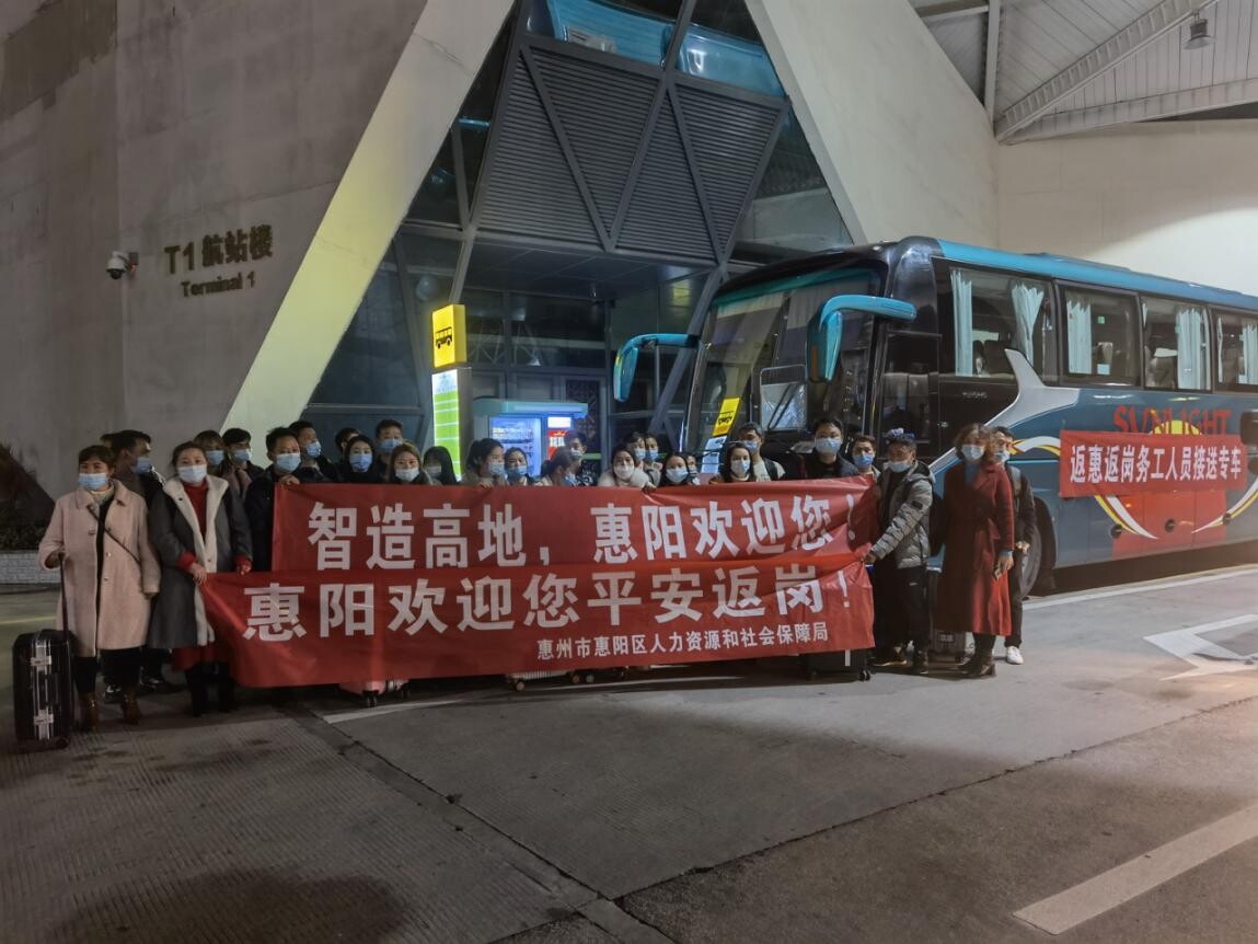 包機在當日晚上11點抵達。惠陽人社局接站工作組早已提前到位,剛出站臺,務工人員就被工作組有序安排上了惠陽區人社局準備的從平潭機場直達惠陽伯恩公司的大巴專車。