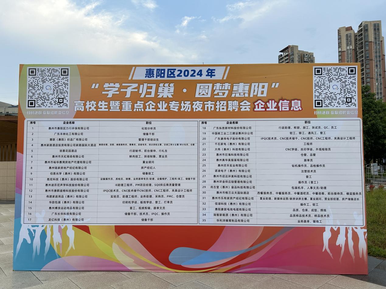 為深入學習貫徹黨的二十大精神,落實省委“1310”具體部署,持續推進廣東青年下鄉返鄉興鄉,助力“百縣千鎮萬村高質量發展工程”三年行動,促進我區高校畢業生盡快就業,8月5日晚,惠陽區人社局聯合團區委開展惠陽區2024年“學子歸巢?圓夢惠陽”高校生暨重點企業專場夜市招聘活動。