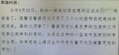 “真的太厲害了!警察同志認真負責的態度和工作效率讓我特別的感動”“非常感謝上塘派出所所有民警同志及輔警同志的幫忙”這樣感情真摯的話語,是來源于“平安廳”廳長信箱里的一封感謝信,這封信的背后,是惠陽公安對群眾生命和財產安全的傾情守護,也是群眾對公安工作的充分肯定。