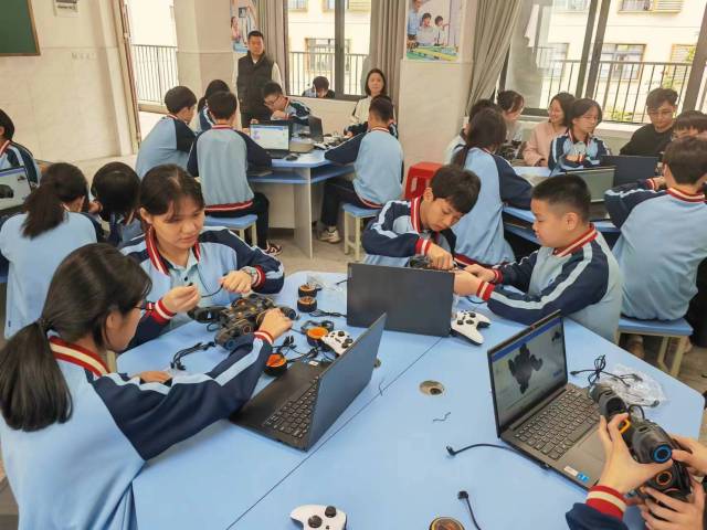 在惠陽區第七中學及附屬小學的AI課上,學生們通過小組合作形式,成功搭建多擬態人工智能教育機器人UGOT變形車。