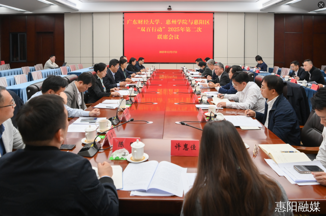12月17日上午,廣東財經(jīng)大學(xué)、惠州學(xué)院、惠陽區(qū)“雙百行動”2025年第二次聯(lián)席會議召開,系統(tǒng)總結(jié)一年來結(jié)對共建成果,共商下一階段深化合作舉措。廣東財經(jīng)大學(xué)黨委副書記劉祖華,惠州學(xué)院副校長魏曉慧,惠州市委教育工委委員、市人民政府教育督導(dǎo)室主任督學(xué)、市教育局黨組副書記孫偉存,惠陽區(qū)委副書記、區(qū)長何國斌,區(qū)委常委、常務(wù)副區(qū)長歐陽惠鼎等參加會議。