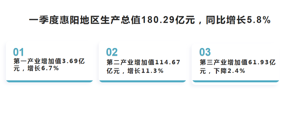 (一)經(jīng)濟(jì)總量平穩(wěn)增長(zhǎng)。根據(jù)惠州市地區(qū)生產(chǎn)總值統(tǒng)一核算結(jié)果,2025年一季度,惠陽(yáng)區(qū)地區(qū)生產(chǎn)總值180.29億元,按不變價(jià)格計(jì)算,同比增長(zhǎng)5.8%。其中,第一產(chǎn)業(yè)增加值3.69億元,同比增長(zhǎng)6.7%;第二產(chǎn)業(yè)增加值114.67億元,同比增長(zhǎng)11.3%;第三產(chǎn)業(yè)增加值61.93億元,同比下降2.4%。