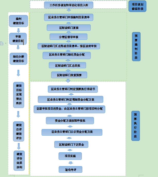 (二)區業務主管部門全面負責本部門預算編制和執行,對分配到用款單位的專項資金執行情況承擔指導和監管責任。包括:負責部門項目庫管理;申報專項資金預算、目錄清單、績效目標,制定明細分配方案;對分管專項資金預算執行情況進行跟蹤監管;負責分管專項資金績效管理、信息公開;組織項目驗收或考評。